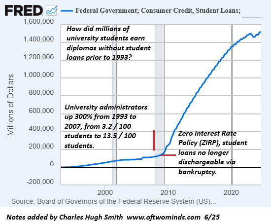 As more of the output goes to corporations and owners of assets, their collateral, income and creditworthiness rise, meaning they can borrow more at lower rates of interest than wage earners and small enterprises. The more they can borrow, the more they can own and the more they can earn. These are the core engines of extreme wealth and income inequality. The rich get richer because they have the means to borrow more income-generating assets at lower rates than wage earners. And unlike wages, this asset-generated income rises as assets increasing in value support additional borrowing as they serve as collateral. On the most fundamental level, if economic expansion no longer increases the income of household borrowers enough to service more debt, the entire structure of expanding debt, collateral and speculation is destabilized.Ultimately, assets generate income from either 1) issuing more debt, 2) investing more in risk assets or 3) consumer spending. All three are interconnected, i.e. tightly bound, as any decline in the expansion of debt, investing or spending eventually bleeds through to reduced ability to service more debt and the end of the expansion of debt. Since debt is inherently risky--borrowers can default, i.e. stop paying interest and principal on the debt--then depending on expanding debt for economic expansion is also increasing risk, especially if household earnings are stagnating while debt and interest payments are increasing. Since the percentage of output flowing to wages has been declining for 50 years, households have funded spending by borrowing more money. Prior to the 2000s, college students borrowed very little to fund their education. Now student loan debt is measured in the trillion-dollar range. Auto loans and credit card debt has also soared, along with shadow-banking debt that isn't even tracked: pay-in-installments, etc.