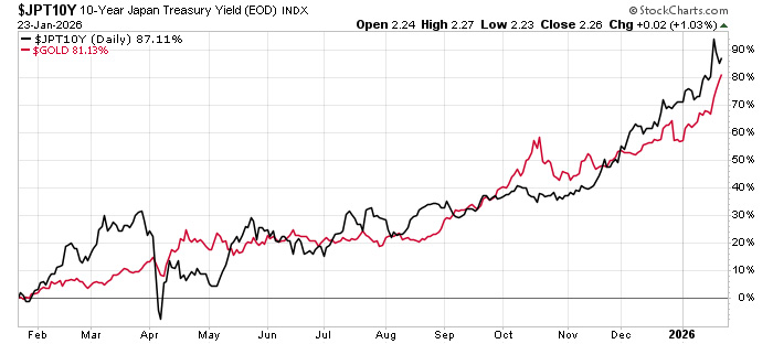 The dirty secret about currencies is that they aren’t backed by any assets. The U.S. dollar is backed by the “Full Faith and Credit” of the U.S. government. There is an old saying that gold is money and everything else is just credit. In other words, gold is an actual payment. Paper is a promise to pay you later. That’s an important distinction. The value of paper money relies on all of us agreeing that it is worth something. That’s true for all currencies today…dollars, yen, euros, etc. It’s all just a wink and a nod that it’s worth something real. The risk is that we stop believing. And that’s what’s happened today…not in the dollar, but in the system. And the rising gold price is a symptom of that. It’s the canary in the coal mine of a potential currency drama. And the problem is Japan. A quick note here, bond yield moves opposite bond prices. Rising yields mean the prices of the bonds are going down. In other words, people are selling long-term Japanese bonds. The 10-year bond yield broke 2.3%. That’s its highest level in 100 years. The ultra long bond yields are also ripping higher. The Japanese 20-year yields reached 3.4%, the 30-year yield broke 3.6%, and 40-year yield hit 4%. The last time we saw this was in 2007, right before the global financial crisis. Investors bailed out of these bonds due to worries about government spending and inflation. More importantly, investors fear that this problem is contagious. That the fears around the yen could spread to other currencies like a virus. And that is driving the price of gold higher. You can see that the gold price moved in lockstep with the Japanese 10-year bond yield. The yield was near zero just four years ago. It doubled since May 2025. That’s an incredible (and troubling) run. As investors sell and drive up the yield, the price of gold goes up: