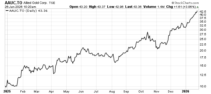 That’s enough to shake the foundations of a global economy that still remembers 2008 quite well. That’s why gold is doing so well right now. The world’s major banks and governments are watching Japan’s banks and worrying. So, they buy gold as insurance against a repeat catastrophe. There is a real chance that, if Japan can get its house in order, the rise in gold price will stop and even fall. If that happens, it will impact miners. So, we’ll need to watch that. But right now, gold miners look very (very) good. Companies that were nearly insolvent a year ago are now forecasting huge profits. The giant mining companies are starting to buy up smaller companies. Today, China’s giant gold miner Zijin Mining Group agreed to buy Canadian gold miner Allied Gold for $5.5 billion (all cash) or $44 per share.