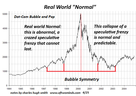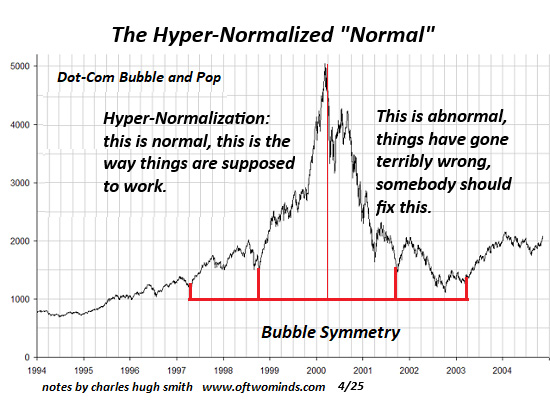 One of the most peculiar hyper-normalized hallucinations about "Capitalism" is that markets and the economy "should always go up" and if they don't, something is terribly wrong and somebody better do something to fix it. Remarkably, this hyper-normalized hallucination is the exact opposite of real-world "Capitalism," which relies on the periodic clearing of excesses of debt, leverage and speculation as its essential mechanism of self-correction and adaptation. If these are stripped out, "Capitalism" fails as a system. The two charts of the NASDAQ stock index below illustrate the astounding divide between a real-world understanding of "Capitalism" and the hyper-normalized hallucination of always goes up "Capitalism." Various justifications are trotted out to support the "markets and GDP should always go up" narrative:
