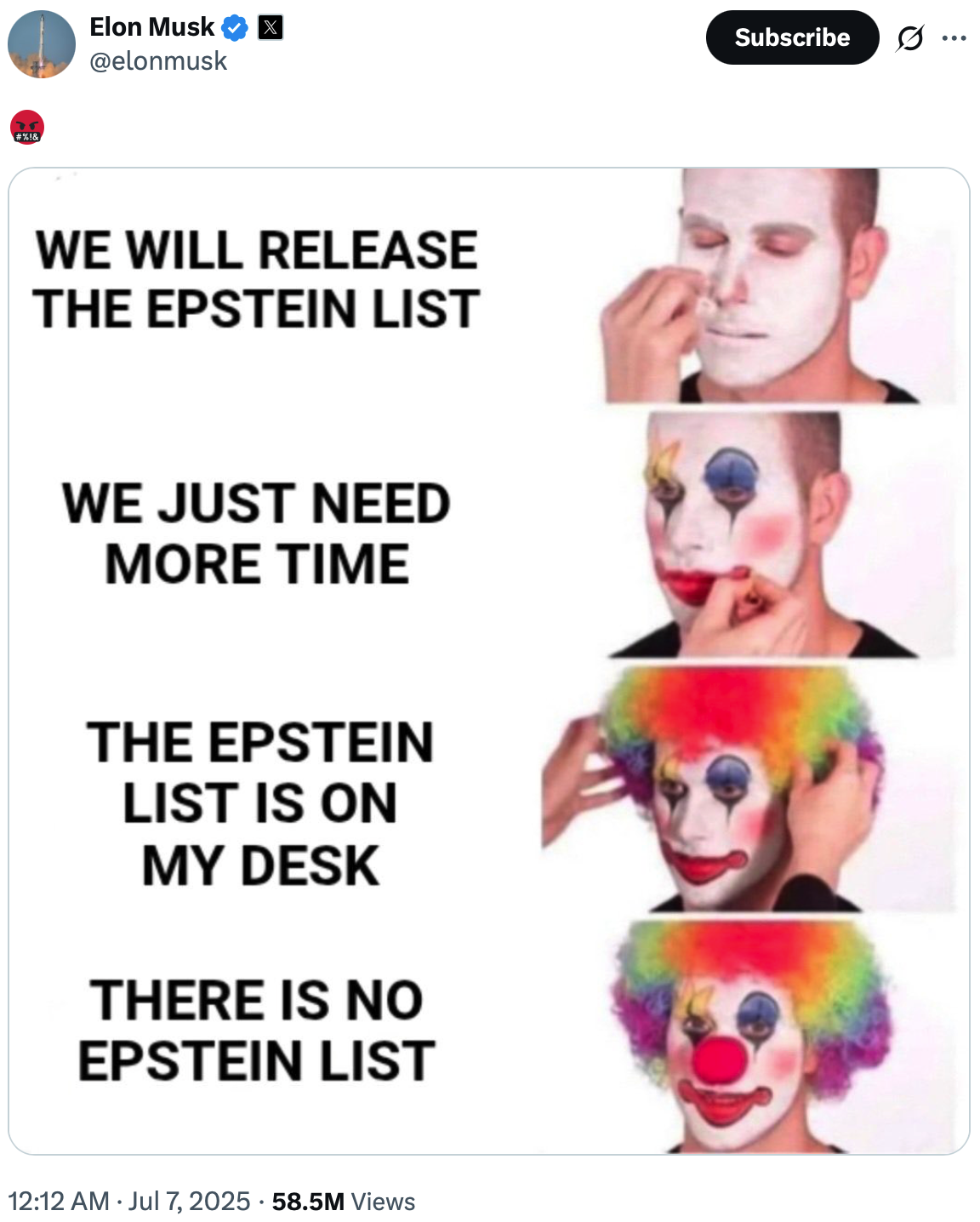 Tech billionaire Elon Musk launched into a meme-based social media tirade early Monday over the Justice Department’s reported conclusion that notorious sex predator Jeffrey Epstein’s much-hyped client list doesn’t actually exist.