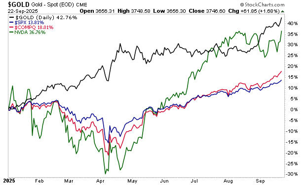 I was thinking a lot about Buffett’s quote yesterday as I watched gold rocket to new all-time highs yesterday. For those who aren’t paying attention, gold is now outperforming every major stock market index as well as every investing legend (including Buffett himself) this year.