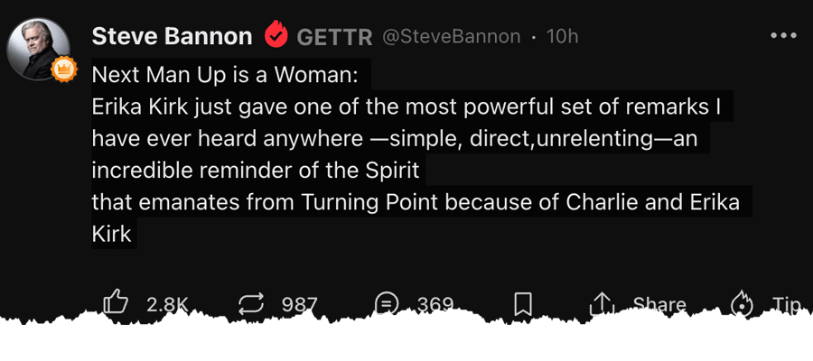 Commenting on Eirk's powerful speech, Steve Bannon wrote on Gettr, "Next Man Up is a Woman: Erika Kirk just gave one of the most powerful set of remarks I have ever heard anywhere —simple, direct,unrelenting—an incredible reminder of the Spirit that emanates from Turning Point because of Charlie and Erika Kirk."