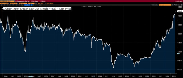 Of particular interest is the behavior of long dated bonds (30-year), where yields are at multi-year highs. The most extreme is Japanese government bonds (JGBs) at 25-year highs.