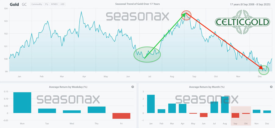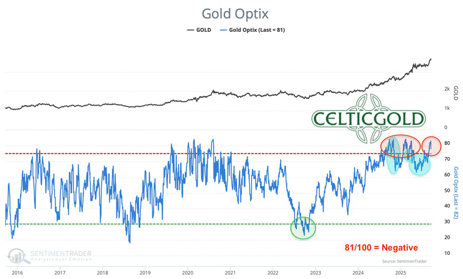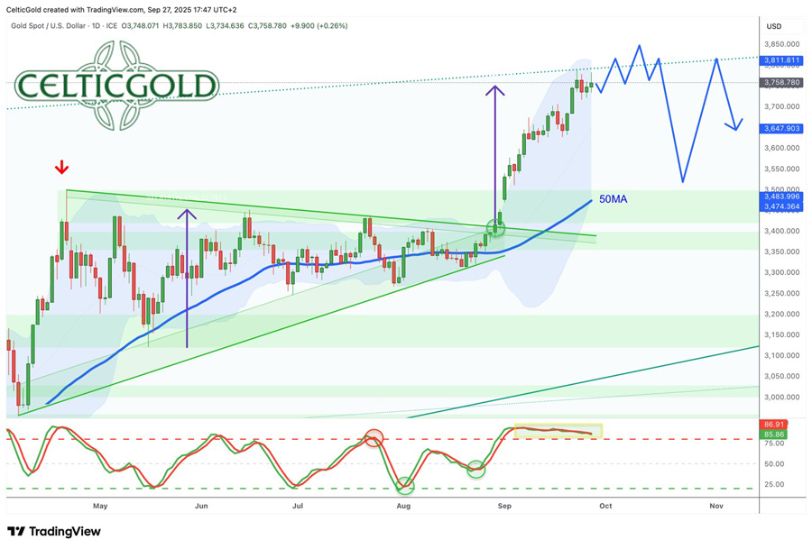 1. Review For more than four months, starting in late April, gold prices have been consolidating at a high level, moving sideways. The powerful rally that began at the start of the year initially peaked on April 22nd at a new all-time high of USD 3,500 before sharply correcting down to USD 3,120. Although bulls managed a solid recovery afterwards, all breakout attempts above the resistance zone between USD 3,400 and 3,450 failed over the following months. At the same time, bears made little progress on the downside. As a result, from late spring into midsummer, prices oscillated mostly between USD 3,200 and 3,400. In August, this trading range narrowed before another pullback took gold down to USD 3,311. From that low point—particularly after the Jackson Hole central bankers’ symposium – gold began a fresh upward move. Breaking out of the multi-month consolidation triangle unleashed pent-up energy, and for the past four weeks prices have been climbing almost daily to new record highs. With the latest peak at USD 3,791, gold has gained nearly 44.5% year-to-date in dollar terms, and 27.7% in euro terms. Silver Surges Past USD 40 for First Time in 14 Years Silver in US-Dollar, weekly chart as of September 27th, 2025. Source: Tradingview Silver has also rallied strongly in recent weeks, most notably overcoming the psychologically important USD 40 mark – a level last seen 14 years ago, in August 2011. While silver’s moves had largely followed gold’s lead, the breakout above USD 40 and subsequent climb beyond USD 46 suggest the market is now moving independently and could soon test the all-time high near USD 50. Around this level, however, a temporary top or at least increased volatility in precious metals is likely. Following their rapid rise, gold, silver, and mining stocks all appear overheated and due for some form of a breather soon. 2. Chart Analysis – Gold in US Dollars Weekly Chart: Next Target USD 4,000 – October or Spring 2026? Gold in US-Dollar, weekly chart as of September 27th, 2025. Source: Tradingview The breakout from the four-month consolidation triangle marked the next leg of the secular bull market. The strength and speed of the recent rally make clear that bulls are in firm control. On higher timeframes, gold is heavily overbought, but this is typical for strong bull markets, where surprises tend to be on the upside. The weekly stochastic has shifted into a bullish embedded state, anchoring the uptrend. At the same time, gold is now trading well above its weekly Bollinger Band (USD 3,693), heightening the risk of sudden pullbacks. Still, no sell signals have emerged – trend momentum currently appears unstoppable. Having already reached the initial target of USD 3,750 derived from the triangle, attention now turns to the critical USD 4,000 level. A sustained rally into the 4,300–4,400 area looks plausible by spring 2026, though near-term upside may be limited. Should gold start to consolidate around USD 3,800 first, the journey to USD 4,000 and beyond could be delayed until the first quarter of 2026. Daily Chart: Waning Momentum Gold in US-Dollar, daily chart as of September 27th, 2025. Source: Tradingview On the daily chart, gold has broken through all resistance levels and entered uncharted territory with no clear support or resistance lines. The Bollinger Bands stretch between USD 3,806 and 3,492, while the stochastic oscillator barely maintained its bullish embedded state into the weekend. Although no reversal signals have formed, momentum has noticeably weakened over the past three sessions. Our USD 3,750 target has already been met, with USD 4,000 now the next milestone. If silver continues towards USD 50, gold could benefit and push higher too. For now, possible extensions towards USD 3,800 – 3,850 remain on the table, though a breakthrough towards USD 4,000 may prove more difficult. Capital rotation into stocks and crypto markets from mid-October could pose headwinds for overbought precious metals. 3. Commitments of Traders for Gold – BearishCommitments of Traders (COT) for gold as of September 23rd, 2025. Source: Sentimentrader At around USD 3,691 on September 23, commercial traders held a net short position of 298,403 gold futures contracts. This sharp increase mirrors the rally seen in recent weeks. While this represents a clear warning signal, it should neither be overstated nor dismissed. The physical market remains dominant, as paper-trading dynamics appear to have lost control. Based on 25 years of data, the CoT report is flashing a strong sell signal. 4. Sentiment for Gold – Euphoria Sentiment Optix for gold as of September 26th, 2025. Source: Sentimentrader The Sentiment Optix indicator is showing elevated optimism levels, bordering on euphoria. This suggests no contrarian entry opportunities. Instead, rapidly rising prices are attracting inexperienced traders eager to jump on board. Historically, such conditions lead to at least a weeks-long correction or a sharp, sudden pullback. Current sentiment is in dangerously euphoric territory and should be treated as a serious warning sign. 5. Seasonality for Gold – Cycle has already shifted to dark orangeSeasonality for gold over the last 17-years as of September 8th, 2024. Source: Seasonax Seasonally, gold tends to find cyclical summer lows by late July to mid-August, followed by a period of strength into September. This year, the timing shifted slightly due to the April peak at USD 3,500. Against this backdrop, a significant interim high should be expected no later than late October. The seasonal backdrop suggests only limited further upside in coming weeks before a corrective phase lasting into mid-December. Seasonality is flashing a strong caution signal. 6. Macro Update – Four longterm fundamental drivers for Gold The steep price increases in the precious metals sector vividly demonstrate that the gold price is far more than just a technical chart phenomenon. Behind the rally lie