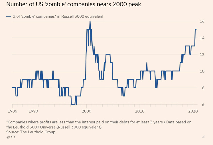 “‘Zombies’ are firms whose debt servicing costs are higher than their profits but are kept alive by relentless borrowing. Such is a macroeconomic problem. Zombie firms are less productive, and their existence lowers investment in, and employment at, more productive firms. In short, a side effect of central banks keeping rates low for a long time is it keeps unproductive firms alive. Ultimately, that lowers the long-run growth rate of the economy.” – Axios