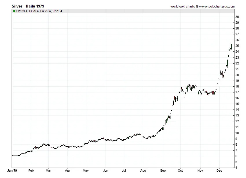 In 1979, silver absolutely exploded higher. The price rose from around $6/oz to $25/oz.