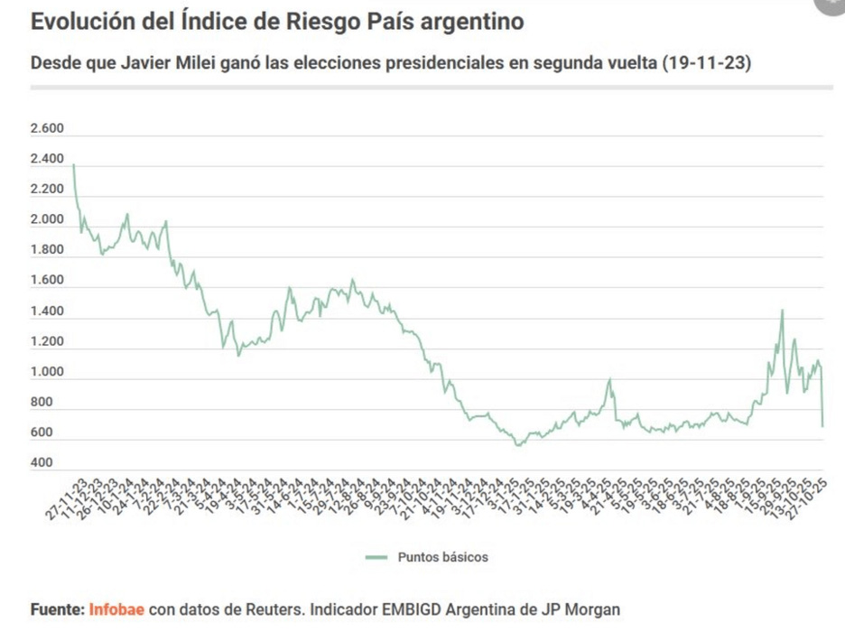The open letter, penned by “influential economists,” a who’s-who of pontificating blowhards led by none other than Thomas Piketty, author of the most pretend-to-have-read economics book of the 21st century, was crammed full of exactly the kind of brainless drivel you would expect from a slack-jawed hodgepodge of career academics. “Javier Milei’s dollarization and fiscal austerity proposals overlook the complexities of modern economies, ignore lessons from historical crises, and open the door for accentuating already severe inequalities,” they wrote, predicting that Milei’s policies “would be deeply damaging for Argentina and very unfortunate for the entire continent.” Milei’s proposals, they continued unironically, were “rooted in laissez-faire economics” (gasp!) and “fraught with risks that make them potentially very harmful for the Argentine economy and the Argentine people.” Again, if by “harmful” and “damaging” they really meant “invigorating” or “rejuvenating” or simply “liberating,” then… yes, they were spot on! But these men are academics, dear reader, surely too clever to misunderstand basic concepts like “words have meaning.” Continued their whiney op-ed: “This is not just the social chaos that could be generated by extreme right positions but also the economic chaos that would ensue from a decline in both public revenues and public spending… “Argentinians are going to vote in an election where there are these very tough choices. But a libertarian solution that vilifies the public sector will only add to the suffering.” Except, the economy is not “suffering.” It is flourishing. Stripped of the burden of public disservice, the forces of free market capitalism are doing what they do best… adding real world value to people’s lives and proving useful idiots and “influential economists” dead wrong along the way. The only “social chaos” we saw in the past month came on the back of the Peronist’s win in a piddling local election here, when people feared a return of that savage blight and rushed to sell their pesos before the print-and-spend brigade was given another chance to torch their savings. Following yesterday’s victory, Argentina’s markets were poised to post their single best day in history today… with national bank and energy stocks up 20…30… 40% and more at time of writting. The peso, surviving the near fatal miss of another Peronist victory, rallied like a cryptocurrency, moonshotting more than 10%. Moreover, country risk premium declined precipitously today, falling almost 40% in a single session. (A lower reading means less implied risk for foreign investors looking to deploy capital here.) It had spiked over 1,400 following the local elections last month (in which the Peronists rose like zombies from their graves). Today, it plummeted into the 600s, continuing a trend of lower risk that has characterized Milei’s free market-friendly presidency and proving once again that, when it comes to investors putting their moolah where their mouths are, “country risk” is really just “socialist risk.” From Infobae and JP Morgan: