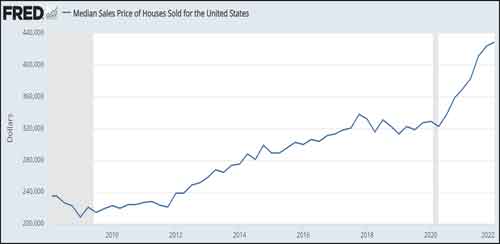However, inflation has now broken out to the upside and hit the highs established in 1980 to 1982. If the Fed now were to stimulate the markets with another round of excessive money printing, for the purpose of avoiding a recession till next year, inflation would go to the all-time record high of 1917, which is when the CPI soared over 19%. From 2008 to 2018, the Fed increased its balance sheet (money printing) by five times (5x) Since that time it has doubled again through mid-2022 so now it is 10x the size of what it was in 2008. That is crazy and irresponsible, to say the least! Monetary history of 2000 years shows that this dilution of the purchasing power of legal tender always ends in disaster. This is the kind of thing that creates hyperinflation However, economists, top Federal Reserve officials, and politicians assure us that inflation is a temporary situation and will decline soon. They don’t say why or how. But they did pass a humongous $739 billion spending bill with big tax increases. They celebrated on the floor of Congress when it passed, with backslapping and “high-fives.” It was even falsely labeled the “Inflation Reduction Act.” Little do they know that they passed an act that will be the trigger for the next “Great Depression” in the US. This is so reminiscent of 1979, when inflation went to double-digits, but is now actually worse. In our Wellington Letter in 1979 we forecast the prime rate to go to 20%, but a top Wall Street economist called that “absurd.” The following year in 1980, the prime rate hit 20%. Over the past 12 years the artificial money creation in major economies has soared to record historic highs. It is no longer just a US problem, it’s a global problem. Money Supply M2, which we always followed closely, the past year hit a 40% rate. This has never been seen before. A rise of 8% used to be alarming. But now no analyst or economist bothers to mention the 40% growth rate. Is it that they don’t know, don’t think it is important, or are they trying not to scare investors? The Fed’s balance sheet reached an incredible, never thought possible, $9 trillion out of thin air earlier this year. That means that it has taken that much artificial money to keep the financial system glued together. That is exactly what is creating today’s big inflation. This is what Zimbabwe, Venezuela, and other hyperinflation countries have done. Any educated person would say that the Fed has to stop what it is doing, lest prices go out of control. But the Fed chair has another concern: keeping his job and not being blamed for a big recession. This year the Fed said it would tighten monetary policy to fight inflation. We have learned over the last 45 years to never trust what the Fed says. What they actually do is often the very opposite of what they say. Remember that earlier this year, the Fed said it was going to “reduce its balance sheet.” That means it would reduce the record trillions of dollars of artificial money and credit creation of the past several years. The money creation has been the propellant of inflation, not Putin or greedy oil executives. But so far they have hardly reduce its balance sheet at all. Inflation is manufactured at the Federal Reserve in Washington. The effective remedy to fight inflation requires actions that will shrink credit and money supply. Both remedies will create a juicy recession and deep bear market in stocks, according to the “Dohmen Theory of Liquidity and Credit.” Eventually, the Fed will have to make that difficult decision. Currently they seem to be “hoping” that inflation might decline through an act of nature. But wishful thinking doesn’t cure the inflation disease. And when the economic recession is finally recognized, the Fed may be urged to step on the accelerator again to prevent an overdue recession. We often hear “hope” from Fed officials, economists and analysts. But that is a very ineffective tool. It is an act of desperation when you have painted yourself into a corner. We consider inflation the most important economic factor. Again, the only way it can be fought is by contracting liquidity and reducing credit. But central banks hesitate to do it as it causes financial markets to plunge, and economies to go into deep recessions. Therefore, central banks typically just hike interest rates, thinking that will reduce inflation as it may reduce borrowing. That is wrong if borrowing is still possible. Higher interest rates cause a rise in the cost of business, which is then passed on in the form of higher prices. Tight (unavailable) money is the only way to get inflation down. But that is bitter medicine to cure the sins of the past. Current inflation has wiped out any employment income gains. Yet people still pay taxes on the inflation-generated income. That’s why politicians like it: inflation is the silent tax. And if people can’t pay the higher tax, there will be an additional 87,000 enforcers soon enough at the IRS, waiting to pounce. If the Congress were serious in helping Americans, they would cut taxes. For example, they would adjust capital gains tax on the sale of your home for inflation. A house bought 50 years ago, now sold at 10 times its original purchase price, has most of the gains because of inflation. It is not a profit! Homeowners think they have done very well. But if they sell, they have to pay big taxes on the illusionary profit. From early 2009, the median priced home was $208,000. The next 11 years, to early 2020, it rose to $322,000. That’s a gain of $114,000 in 11 years. Not bad. But from early 2020 to early 2022, just two years later, that priced soared to $428,000, for a gain of $106,000 in just two years. Or a total gain of $220,000 in 14 years. However, that is not a profit because a new house would cost you that much…or more. Here is the chart from the Fed showing how the median sales price for homes has skyrocketed since 2020: Economic history