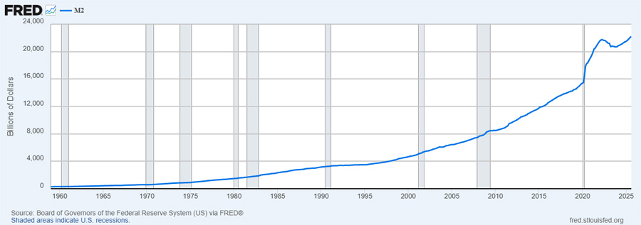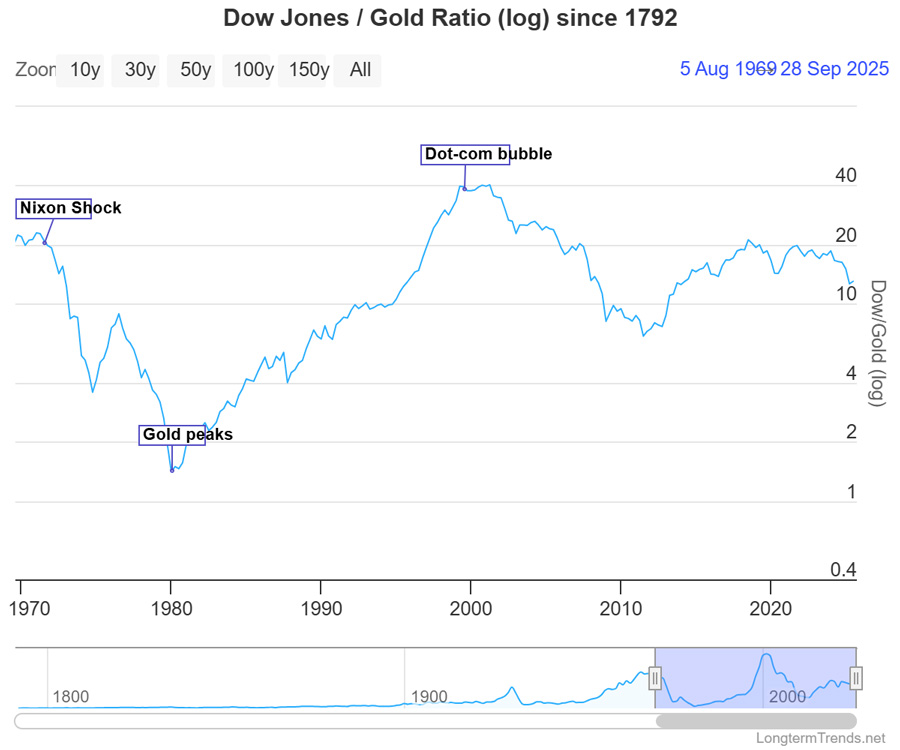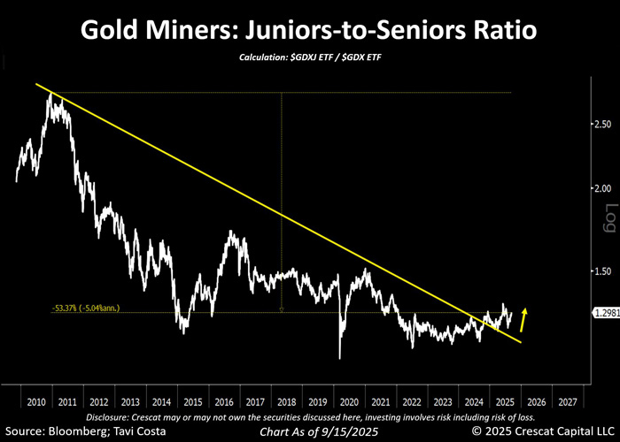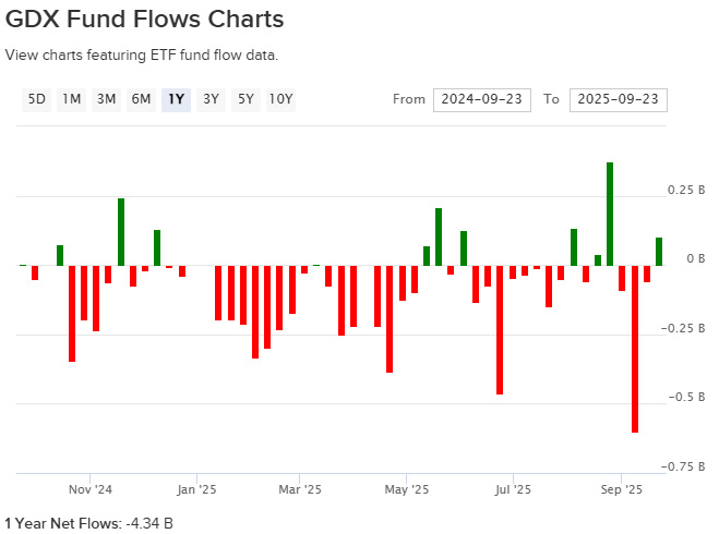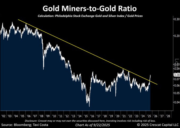 Are We There Yet? Over the past few weeks, I have received multiple inbounds asking what to do about our precious metals exposure. As of the start of Q3, gold (XAU) is up over 45% while gold miners (GDX) are up over 100%. Most charts bare the resemblance of a hockey stick. Understandably, some of you might be getting a little nervous. So, here’s my take. On a purely technical basis, it is true that we are in overbought conditions, meaning the Relative Strength Index (RSI) – a measure of the speed and magnitude of a security’s recent price changes – is above its upper threshold. These moves are usually followed by a reversal to more neutral RSI levels, often accompanied by a pullback. There are bound to be bumps along the way, especially after such a breathtaking climb, but I believe gold and particularly its miners remain remarkably under-owned. In fact, GDX fund flows are still net negative, having shed roughly 20% of its shares outstanding since the start of the year, as shown in the graph below. While the longer-term setup for gold and its miners still looks attractive, I have to be pragmatic and seek to manage risk. With gold at inflation-adjusted all-time highs, for me, prudence is harvesting some profits, rebalancing my portfolio and building up cash reserves for a rainy day. Risks of a near-term pullback may have increased ever so slightly with the flurry of ‘positive’ macro data received late last week (PMIs, GDP, jobless claims, new home sales, etc.), as it raises doubts over the need for further Fed rate cuts. But make no mistake, I strongly believe we are still in an extremely accommodative environment where monetary and fiscal policy are working to suppress the dollar, lower real yields and increase overall liquidity. It’s no surprise that M2 money supply reached a new all-time high in August, as shown in the chart below from the Federal Reserve Bank of St Louis, dated 09/30/2025. Year-over-year, M2 money supply increased by $1 Trillion. During that same period, the World Gold Council estimates that global gold mine production was approximately 135 million ounces. At today’s price of roughly $3,800/oz, that is about $500B, or about half of the increase in M2 money supply – or just under one fourth of new US federal debt added during the same period. As of September 30th, 2025, US federal debt stood at a staggering $37.4 trillion… We aren’t the only ones who see a problem. As I’ve said before, I think the smart money has been making moves ever since the US chose to freeze Russia’s reserve assets. And now, for the first time since 1996, foreign central banks own more gold than US Treasuries. It seems like gold has reclaimed its rightful place as the ultimate safe haven. Jumping on the band wagon, major financial institutions are suddenly recommending gold as part of a diversified portfolio. In some instances, they even recommend replacing part of the bond allocation in a 60/40 portfolio to gold – the new 60/20/20 portfolio. I must admit. That last part makes me nervous too… So, we go back to basics… Beginning with some anecdotal evidence, my team and I were at the Beaver Creek Precious Metals Summit and the Denver Gold Show a few weeks ago. While attendees were obviously excited, we didn’t see signs of irrational exuberance and most of the people we saw were the same old faces we’ve seen a dozen times. No one new. Mining companies were talking about returning profits to shareholders, paying down debt, and remaining capital disciplined. On a side note, at over 50% Free Cash Flow (FCF) margin, gold mining companies are looking like much better businesses than even the Mag 7. And most are still trading at or below 1x Net Asset Value (NAV). These are not the signs of an over-crowded trade, in my opinion. Looking at the ratio between the Dow Jones Industrial Average (DJIA) and gold, you can see that despite the recent rise, gold is still historically undervalued relative to the DJIA. You can see the same relationship when looking at the entire commodities sector relative to the DJIA. For a long time now, commodities have been under-invested, leading to tighter and tighter mine supply. Arguably a positive setup for other raw materials with a finite supply and strong demand drivers (e.g. copper). But I digress. The point is it looks like commodities are making a comeback, and gold is leading the charge. Yet still gold remains, “the most talked about trade that nobody owns.” Finishing with two charts from Tavi Costa. If you don’t own gold mining equities, these charts might make you reconsider. These both highlight how gold miners have long underperformed the physical metal but have just recently started to outperform. He goes on to point out how junior gold miners have broken out and are starting to outperform the more mature (and less leveraged) senior gold miners. Something to think about… Hopefully this helped to address some concerns regarding the current bull market in precious metals.