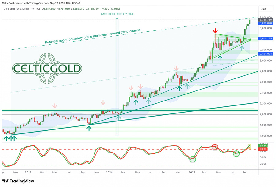 1. Review For more than four months, starting in late April, gold prices have been consolidating at a high level, moving sideways. The powerful rally that began at the start of the year initially peaked on April 22nd at a new all-time high of USD 3,500 before sharply correcting down to USD 3,120. Although bulls managed a solid recovery afterwards, all breakout attempts above the resistance zone between USD 3,400 and 3,450 failed over the following months. At the same time, bears made little progress on the downside. As a result, from late spring into midsummer, prices oscillated mostly between USD 3,200 and 3,400. In August, this trading range narrowed before another pullback took gold down to USD 3,311. From that low point—particularly after the Jackson Hole central bankers’ symposium – gold began a fresh upward move. Breaking out of the multi-month consolidation triangle unleashed pent-up energy, and for the past four weeks prices have been climbing almost daily to new record highs. With the latest peak at USD 3,791, gold has gained nearly 44.5% year-to-date in dollar terms, and 27.7% in euro terms. Silver Surges Past USD 40 for First Time in 14 Years Silver in US-Dollar, weekly chart as of September 27th, 2025. Source: Tradingview Silver has also rallied strongly in recent weeks, most notably overcoming the psychologically important USD 40 mark – a level last seen 14 years ago, in August 2011. While silver’s moves had largely followed gold’s lead, the breakout above USD 40 and subsequent climb beyond USD 46 suggest the market is now moving independently and could soon test the all-time high near USD 50. Around this level, however, a temporary top or at least increased volatility in precious metals is likely. Following their rapid rise, gold, silver, and mining stocks all appear overheated and due for some form of a breather soon. 2. Chart Analysis – Gold in US Dollars Weekly Chart: Next Target USD 4,000 – October or Spring 2026? Gold in US-Dollar, weekly chart as of September 27th, 2025. Source: Tradingview The breakout from the four-month consolidation triangle marked the next leg of the secular bull market. The strength and speed of the recent rally make clear that bulls are in firm control. On higher timeframes, gold is heavily overbought, but this is typical for strong bull markets, where surprises tend to be on the upside. The weekly stochastic has shifted into a bullish embedded state, anchoring the uptrend. At the same time, gold is now trading well above its weekly Bollinger Band (USD 3,693), heightening the risk of sudden pullbacks. Still, no sell signals have emerged – trend momentum currently appears unstoppable. Having already reached the initial target of USD 3,750 derived from the triangle, attention now turns to the critical USD 4,000 level. A sustained rally into the 4,300–4,400 area looks plausible by spring 2026, though near-term upside may be limited. Should gold start to consolidate around USD 3,800 first, the journey to USD 4,000 and beyond could be delayed until the first quarter of 2026. Daily Chart: Waning Momentum Gold in US-Dollar, daily chart as of September 27th, 2025. Source: Tradingview On the daily chart, gold has broken through all resistance levels and entered uncharted territory with no clear support or resistance lines. The Bollinger Bands stretch between USD 3,806 and 3,492, while the stochastic oscillator barely maintained its bullish embedded state into the weekend. Although no reversal signals have formed, momentum has noticeably weakened over the past three sessions. Our USD 3,750 target has already been met, with USD 4,000 now the next milestone. If silver continues towards USD 50, gold could benefit and push higher too. For now, possible extensions towards USD 3,800 – 3,850 remain on the table, though a breakthrough towards USD 4,000 may prove more difficult. Capital rotation into stocks and crypto markets from mid-October could pose headwinds for overbought precious metals. 3. Commitments of Traders for Gold – BearishCommitments of Traders (COT) for gold as of September 23rd, 2025. Source: Sentimentrader At around USD 3,691 on September 23, commercial traders held a net short position of 298,403 gold futures contracts. This sharp increase mirrors the rally seen in recent weeks. While this represents a clear warning signal, it should neither be overstated nor dismissed. The physical market remains dominant, as paper-trading dynamics appear to have lost control. Based on 25 years of data, the CoT report is flashing a strong sell signal. 4. Sentiment for Gold – Euphoria Sentiment Optix for gold as of September 26th, 2025. Source: Sentimentrader The Sentiment Optix indicator is showing elevated optimism levels, bordering on euphoria. This suggests no contrarian entry opportunities. Instead, rapidly rising prices are attracting inexperienced traders eager to jump on board. Historically, such conditions lead to at least a weeks-long correction or a sharp, sudden pullback. Current sentiment is in dangerously euphoric territory and should be treated as a serious warning sign. 5. Seasonality for Gold – Cycle has already shifted to dark orangeSeasonality for gold over the last 17-years as of September 8th, 2024. Source: Seasonax Seasonally, gold tends to find cyclical summer lows by late July to mid-August, followed by a period of strength into September. This year, the timing shifted slightly due to the April peak at USD 3,500. Against this backdrop, a significant interim high should be expected no later than late October. The seasonal backdrop suggests only limited further upside in coming weeks before a corrective phase lasting into mid-December. Seasonality is flashing a strong caution signal. 6. Macro Update – Four longterm fundamental drivers for Gold The steep price increases in the precious metals sector vividly demonstrate that the gold price is far more than just a technical chart phenomenon. Behind the rally lie