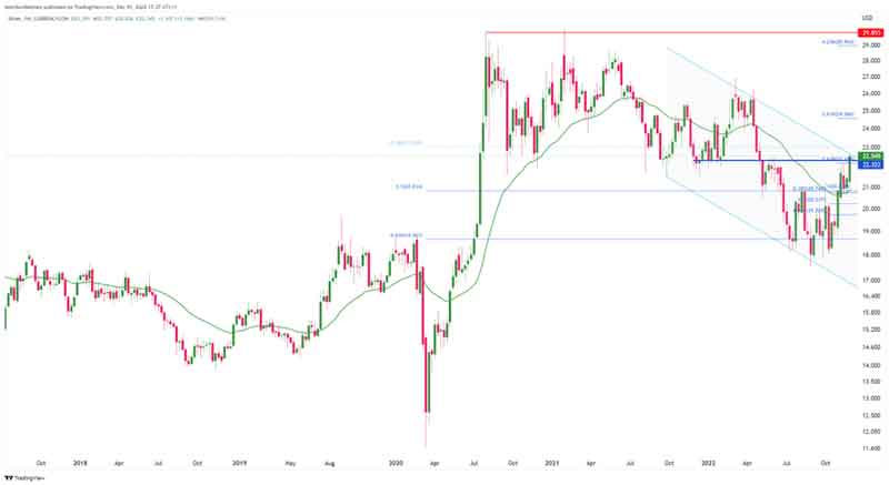 A break up will open for a more bullish 5 wave trend move and longer-term bullish outlook. The importance of the pivot around $22,50 cannot be overestimated because it can ignite a multitude of new higher targets.